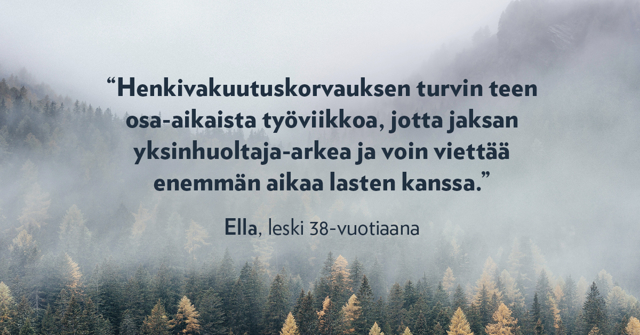 Ella tekee osa-aikaista työviikkoa henkivakuutuskorvauksen turvin, jotta jaksaa paremmin yksinhuoltaja-arkea, ja koska haluaa viettää mahdollisimman paljon aikaa lasten kanssa.